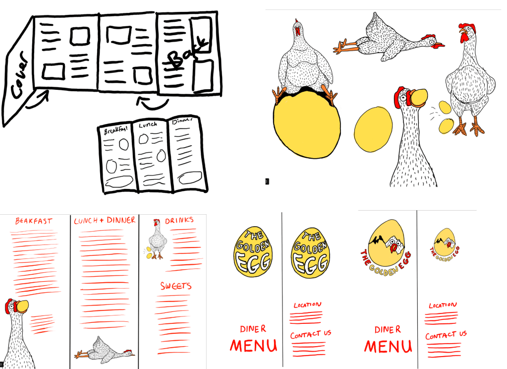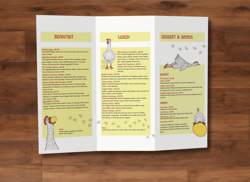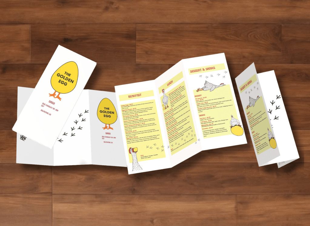 The menu design for The Golden Egg Diner reflects the brand’s playful yet approachable identity. A bright yellow and warm red palette is paired with clean typography to ensure clarity and readability, even in a busy dining setting. Illustrations of hens, eggs, and subtle footprints are used throughout as lighthearted accents, reinforcing the diner’s theme while keeping the design fun and memorable. Organized into clear sections—breakfast, lunch, and dessert & drinks—the layout prioritizes accessibility, allowing customers to easily navigate their choices. The balance of personality and practicality ensures the menu feels inviting while maintaining a polished, professional standard.