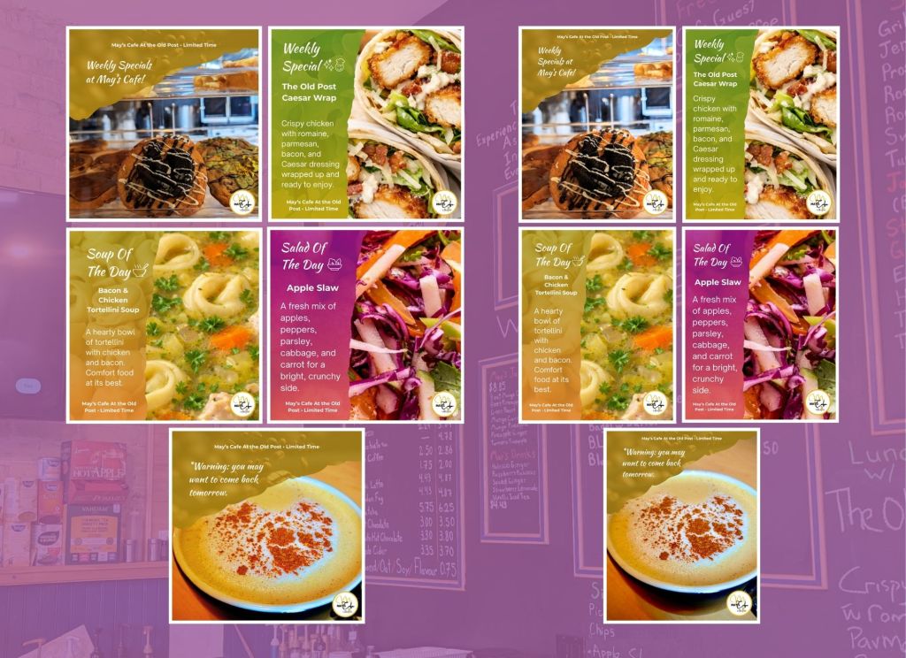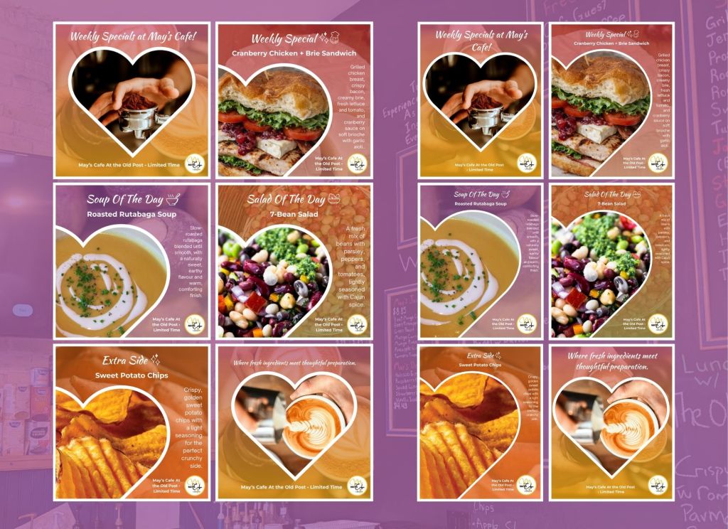 The brand voice for May’s Café was developed to reflect its warm, community-focused atmosphere and the quality of its handmade offerings. The tone is welcoming, authentic, and approachable, emphasizing comfort, connection, and everyday moments. Messaging avoids overly promotional language, instead focusing on inviting customers into an experience, whether that’s enjoying a quiet coffee, sharing a meal, or being part of the café’s community.