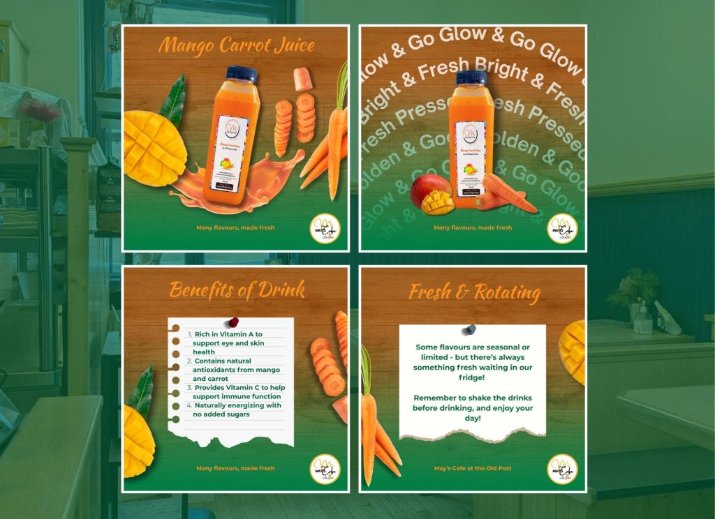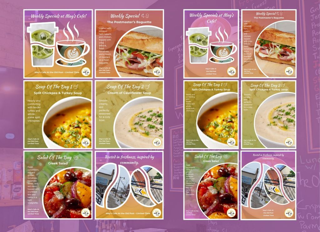 To address these challenges, I implemented a systems-based design approach that focused on both operational clarity and visual consistency. This included developing standardized employee guides and recipe documentation, redesigning menus with clear hierarchy and improved readability, and creating flexible, reusable templates for social media content. I also shifted the visual direction toward a more image-driven approach, prioritizing real photography to better reflect the café’s products and atmosphere. By combining structured systems with adaptable design solutions, I was able to support both the day-to-day needs of the business and its long-term brand development.