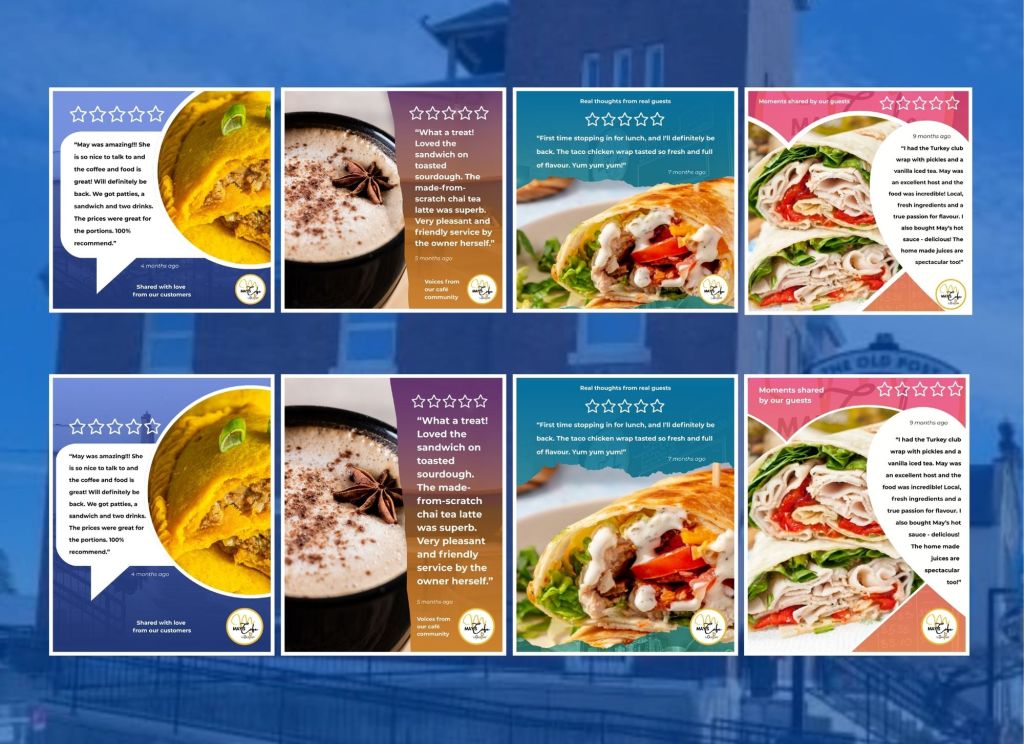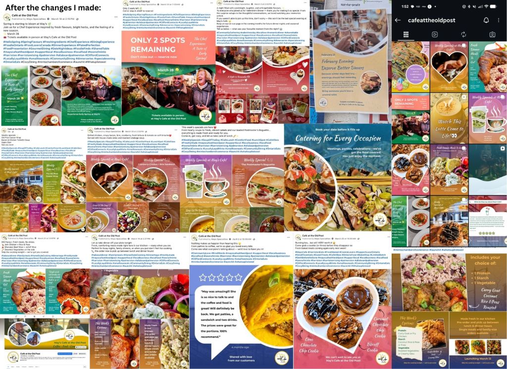 Content development throughout this project was highly iterative, shaped by ongoing feedback and real-time testing. Early designs focused on structure and consistency but were often too text-heavy and repetitive. Over time, the approach shifted toward a more visual-first direction, prioritizing real photography and simplifying layouts to better highlight the café’s products and atmosphere. Template systems were also adapted to allow more variation in composition while maintaining consistency. This process of continuous refinement led to more engaging, cohesive, and effective content.