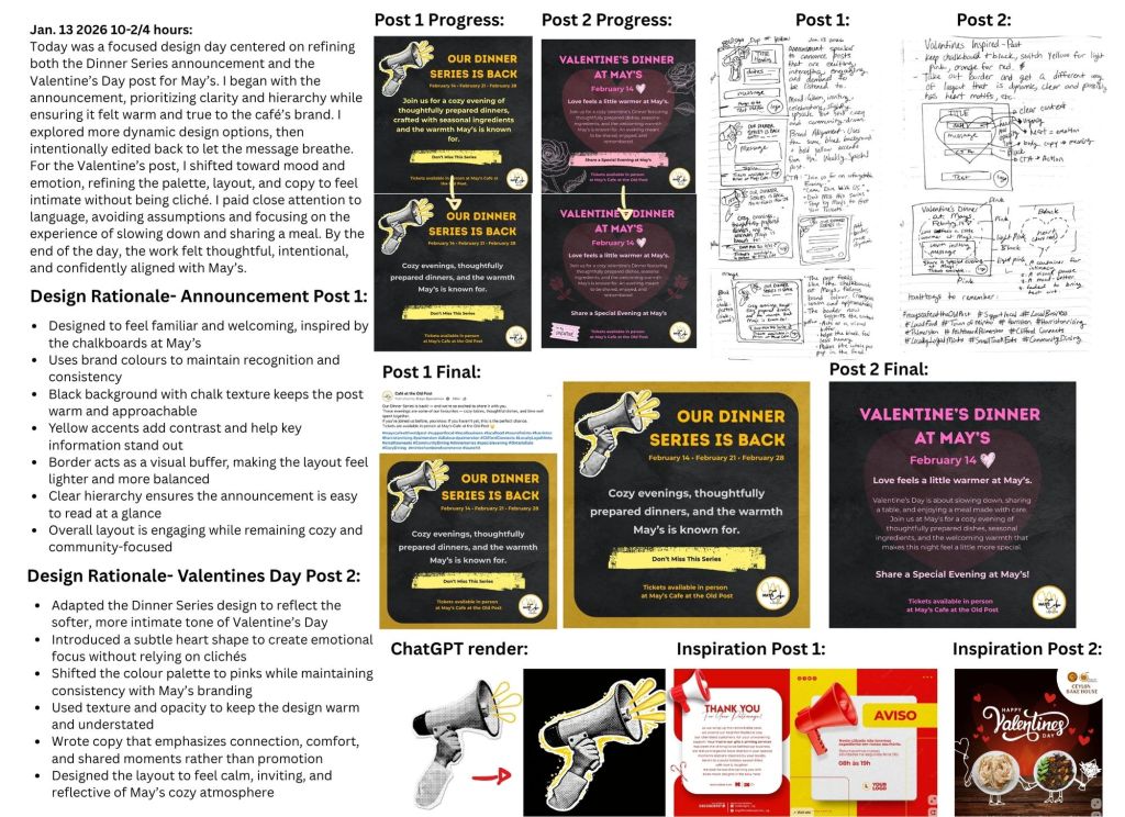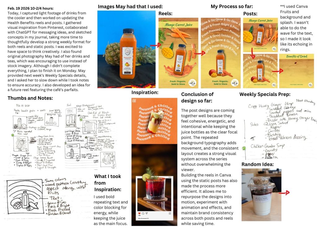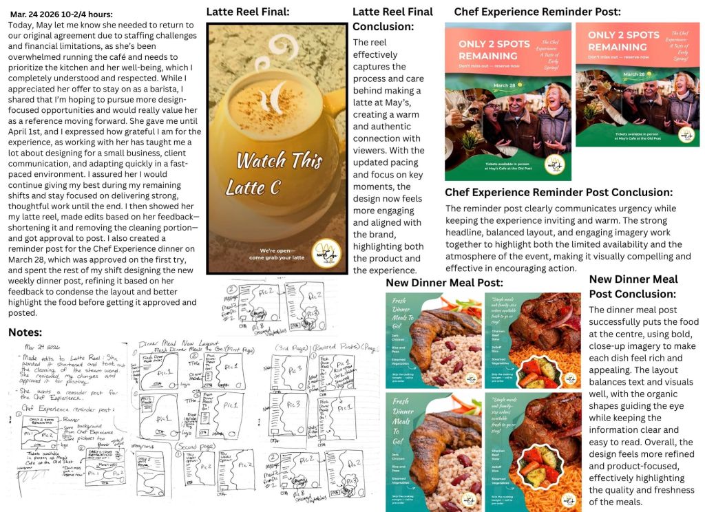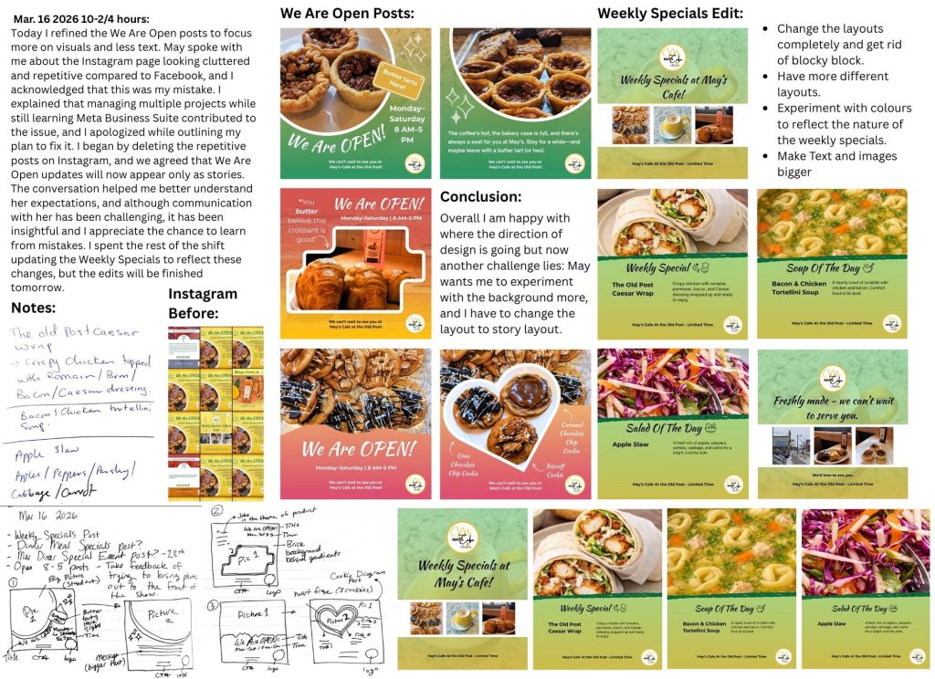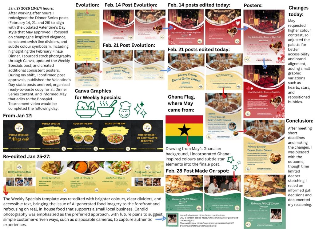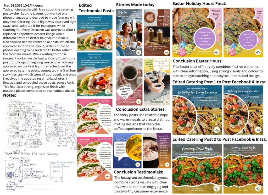 The project was shaped by several real-world constraints, including limited time, evolving direction, and access to information. Many deliverables required same-day turnaround, which reduced opportunities for extended planning and iteration. Creative briefs were often minimal or developed in real time, requiring me to interpret needs and adapt quickly based on feedback. Additionally, not always being on-site and working within a fast-paced café environment made it challenging to gather accurate information and capture content consistently. These constraints required a flexible, solution-oriented approach, balancing speed with thoughtful design decisions.