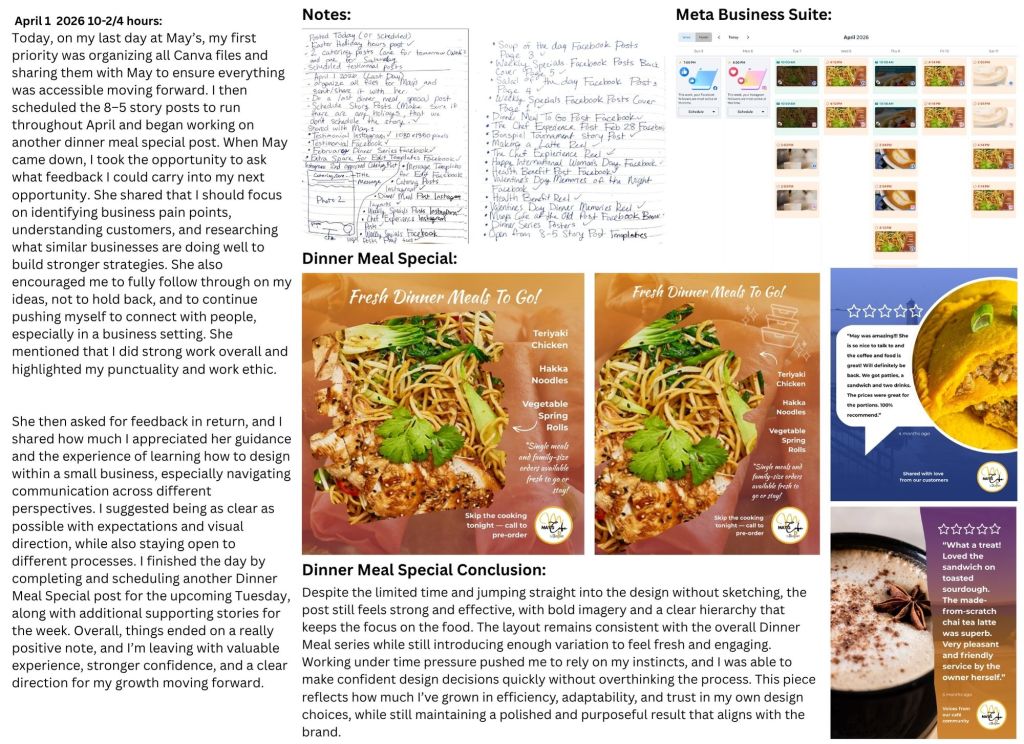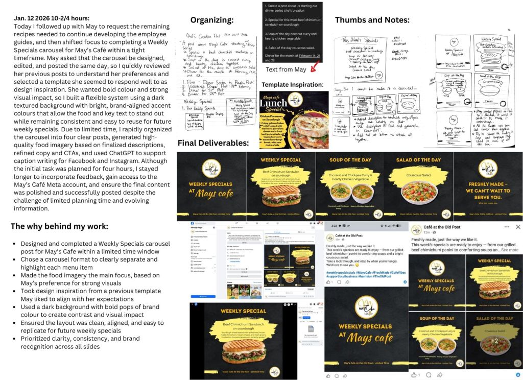 Throughout this three-month project, I worked directly with the café owner in a fast-paced environment, balancing day-to-day design needs with long-term system building. My role expanded from creating individual assets to developing cohesive operational and visual systems, while adapting to tight deadlines, evolving feedback, and the realities of designing for a small business.