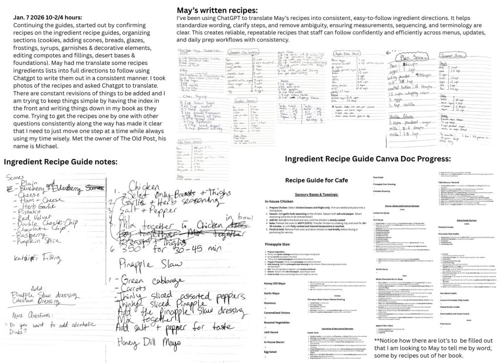 To improve internal efficiency, I created structured employee guides and standardized recipe documentation. This included organizing content into clear categories, translating handwritten notes into step-by-step instructions, and ensuring consistency in formatting and terminology.