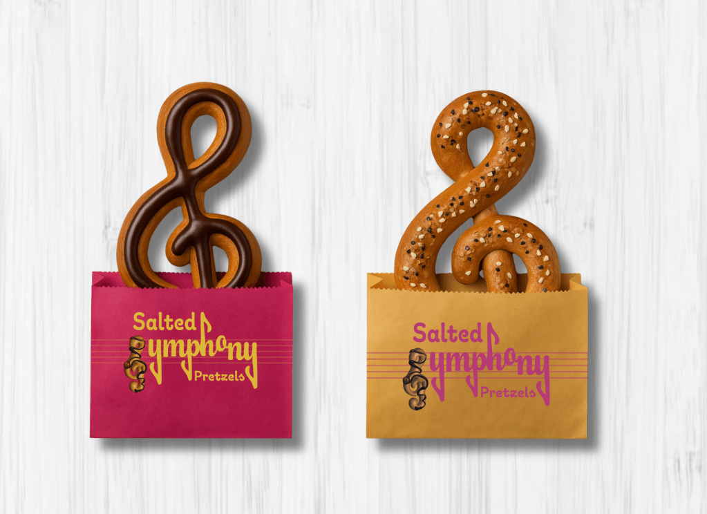 The development of Salted Symphony Pretzels followed an iterative design process that explored how to merge the familiar comfort of pretzels with the creativity of music. Early sketches and brainstorming focused on playful ways to integrate musical elements—like notes, treble clefs, and rhythms—into the logo and packaging. The process balanced experimentation with refinement, ensuring that the final concept felt fun and imaginative without overwhelming clarity or usability. By testing layouts, color palettes, and brand applications, the design evolved into a system that is both memorable and market-ready.
