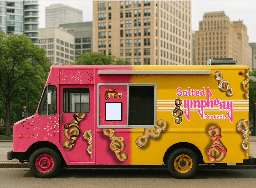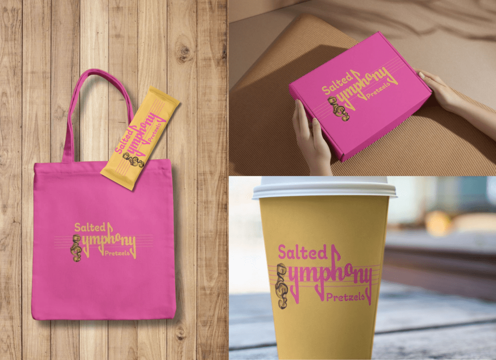 The branding for Salted Symphony Pretzels is designed to be bold, whimsical, and instantly recognizable. Using flowing, music-inspired typography, the logo connects the act of snacking with the joy of rhythm and harmony. A warm golden palette reinforces the pretzel theme while evoking energy and appetite, contrasted with playful accents that keep the identity approachable. Supporting visuals—such as treble clefs, notes, and rhythm-inspired graphics—extend across packaging and merchandise, reinforcing brand consistency. The overall strategy is to elevate pretzels beyond a simple snack, transforming them into a fun, expressive brand experience that sings off the shelf.
